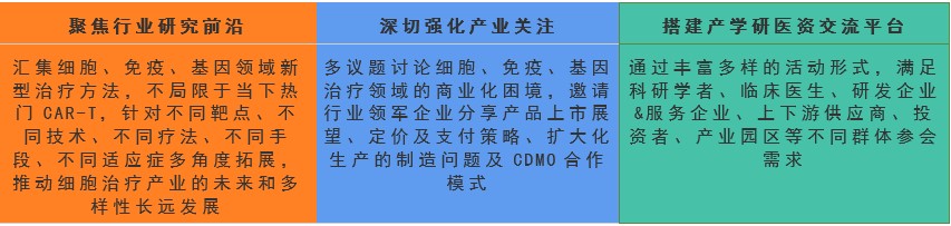 本屆大會(huì)誠(chéng)邀國(guó)內(nèi)外領(lǐng)先學(xué)術(shù)科研機(jī)構(gòu)、大型醫(yī)院、產(chǎn)業(yè)鏈上下游企業(yè)、國(guó)家監(jiān)管機(jī)構(gòu)、產(chǎn)業(yè)園區(qū)、投資機(jī)構(gòu)、行業(yè)協(xié)會(huì)等專業(yè)人士共聚上海,分享行業(yè)進(jìn)展動(dòng)態(tài),探討產(chǎn)業(yè)發(fā)展瓶頸及細(xì)胞治療和基因治療的未來之路!