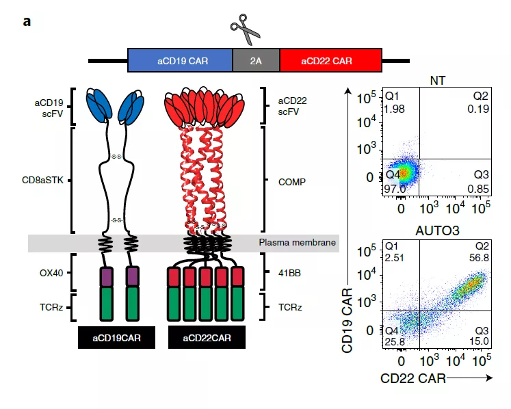 20211012日,Nature Medicine期刊上公布了抗CD19和抗CD22 CAR的自體轉(zhuǎn)導(dǎo)T細(xì)胞(AUTO3)在復(fù)發(fā)性或難治性B-ALLn=15)的兒童和年輕成年患者中的I期試驗(yàn),以評(píng)估AUTO3的療效。