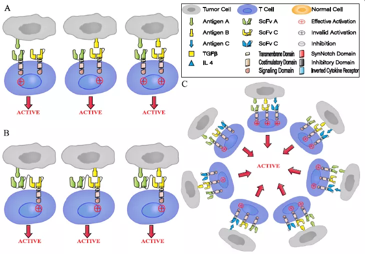 盡管多項(xiàng)研究數(shù)據(jù)顯示,多靶向CAR-T治療多種惡性腫瘤的療效顯示積極,成為預(yù)防抗原逃避的有效手段,但這種類型的CAR-T細(xì)胞可被多個(gè)靶抗原識(shí)別并高強(qiáng)度激活T細(xì)胞,容易引起細(xì)胞因子風(fēng)暴,并對(duì)低表達(dá)靶抗原的正常細(xì)胞過(guò)度殺傷。